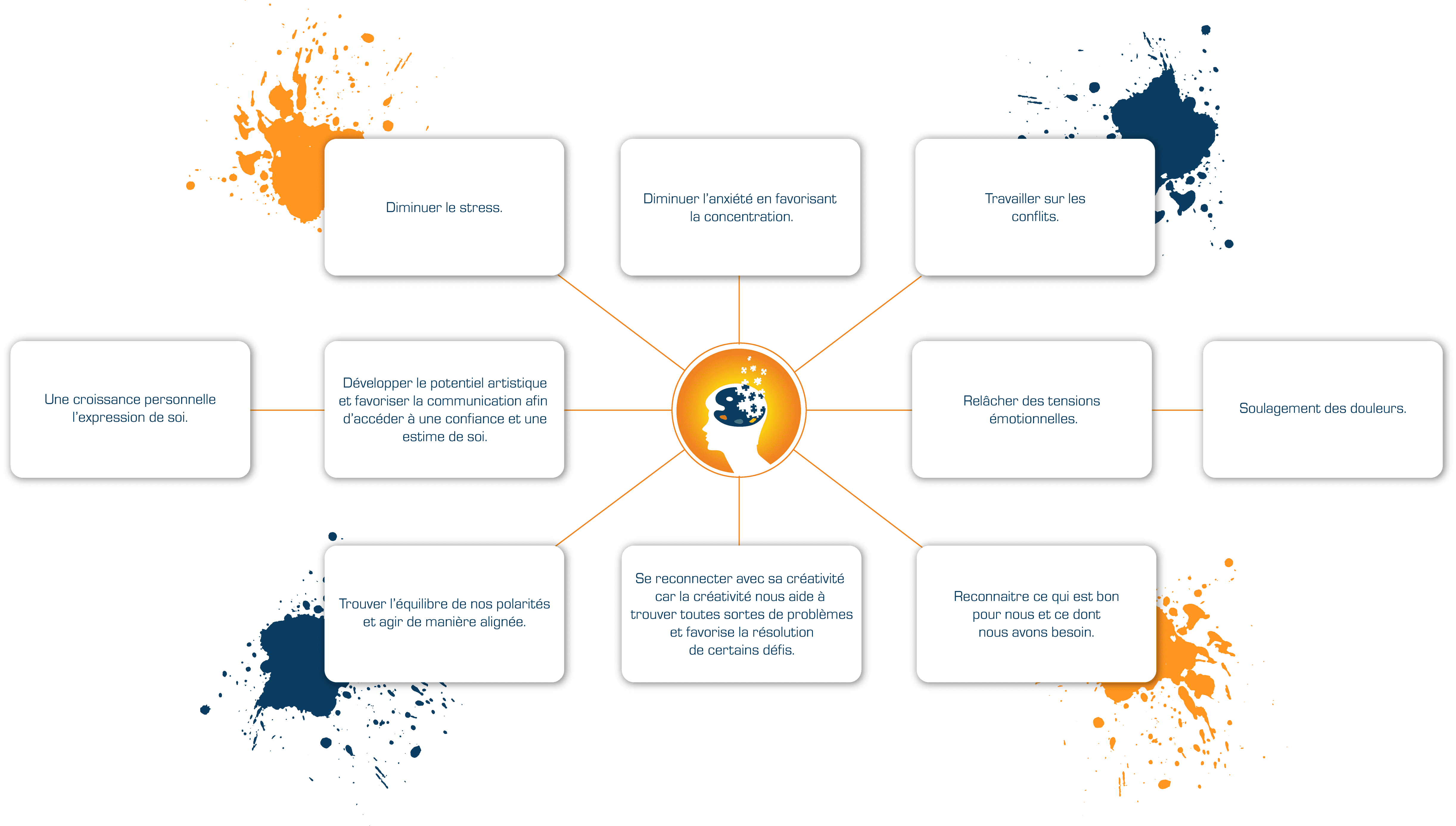 La création et le moment vécu, eux sont thérapeutiques. Au contact de cette réalisation créative, l’outil met en lumière des phénomènes inconscients et diverses manières de libérer nos émotions enfouies au plus profond de nous.