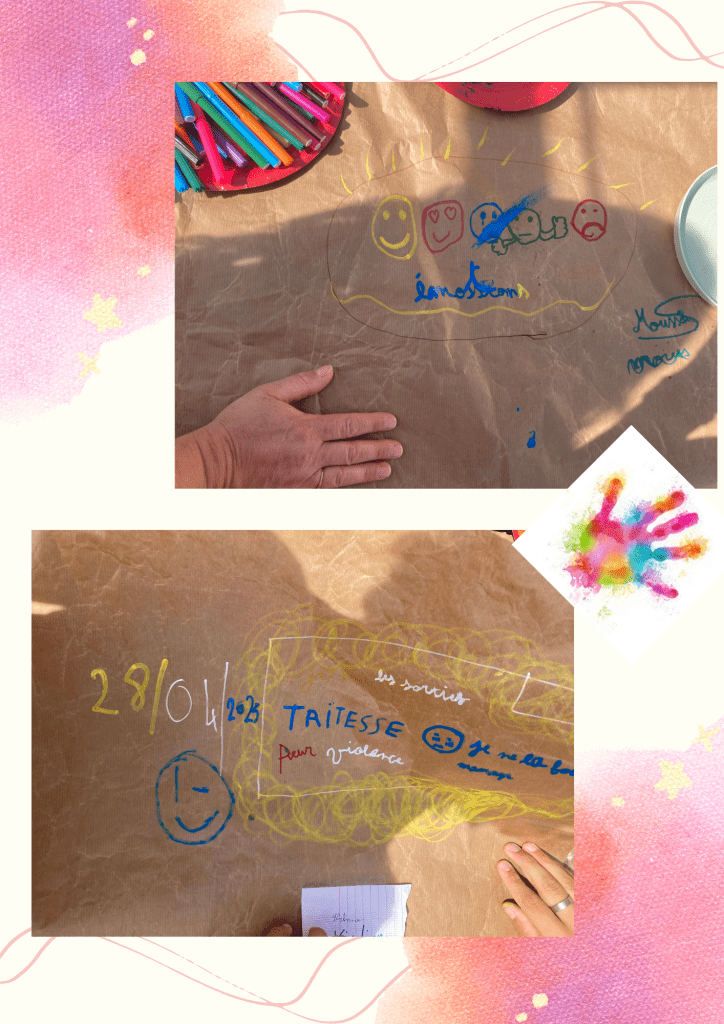 Séance à la découverte des émotions, feutres puis craies. Quel est l’émotion du moment ? l’exprimer, la décrire, la dessiner.
